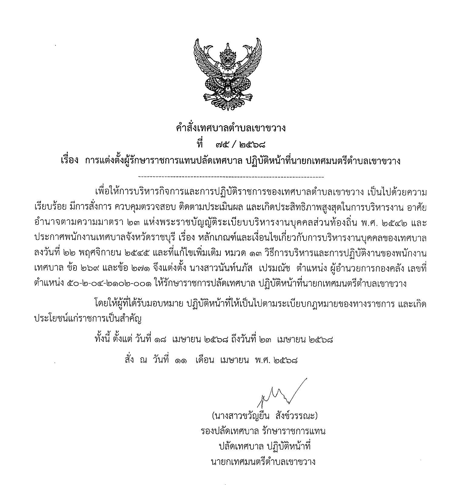 คำสั่ง เรื่อง การแต่งตั้งผู้รักษาราชการแทนปลัดเทศบาล ปฏิบัติหน้าที่นายกเทศมนตรีตำบลเขาขวาง