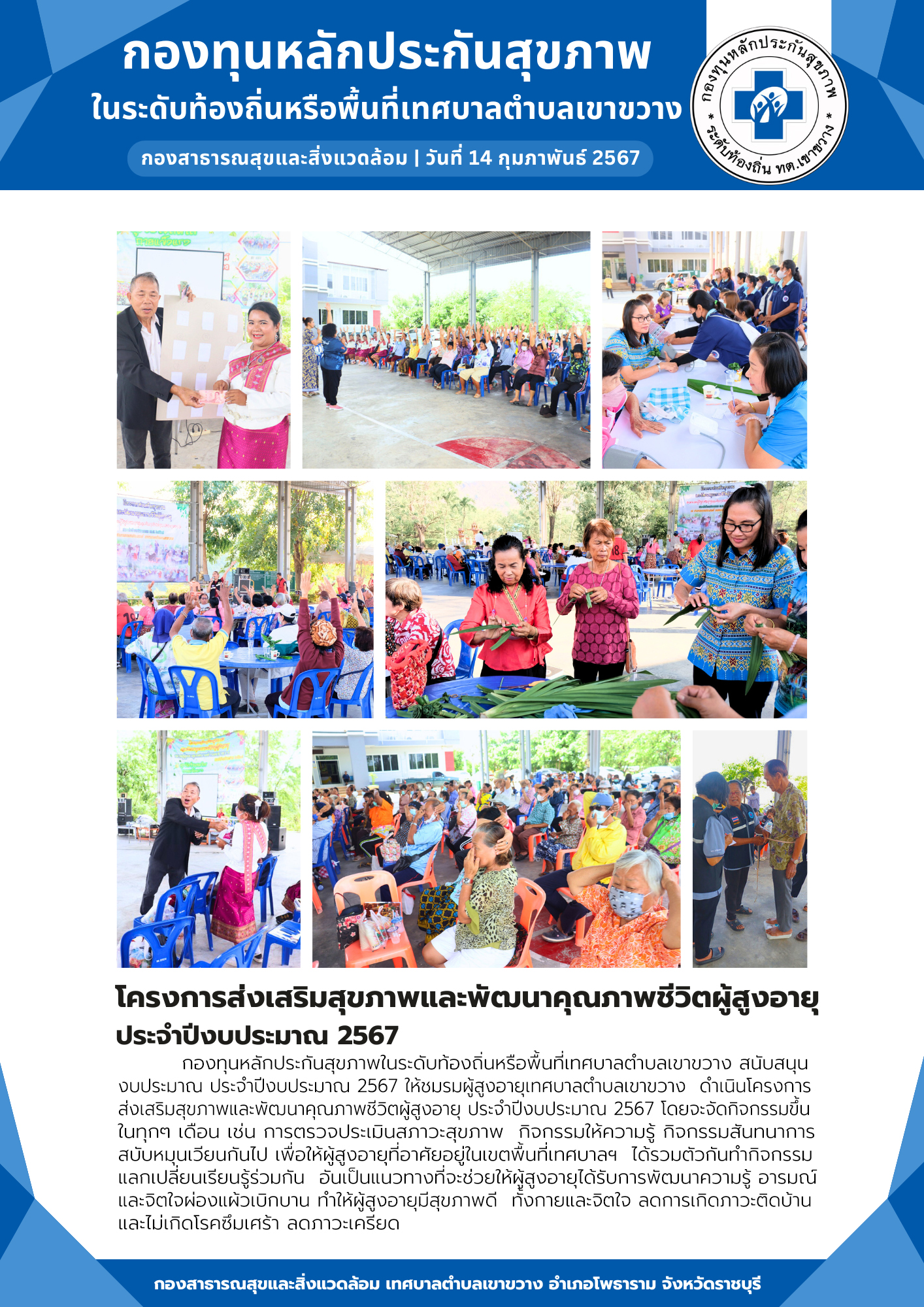 ข่าวประชาสัมพันธ์กองสาธารณสุข: โครงการส่งเสริมสุขภาพและพัฒนาคุณภาพชีวิตผู้สูงอายุ ประจำปีงบประมาณ 2567