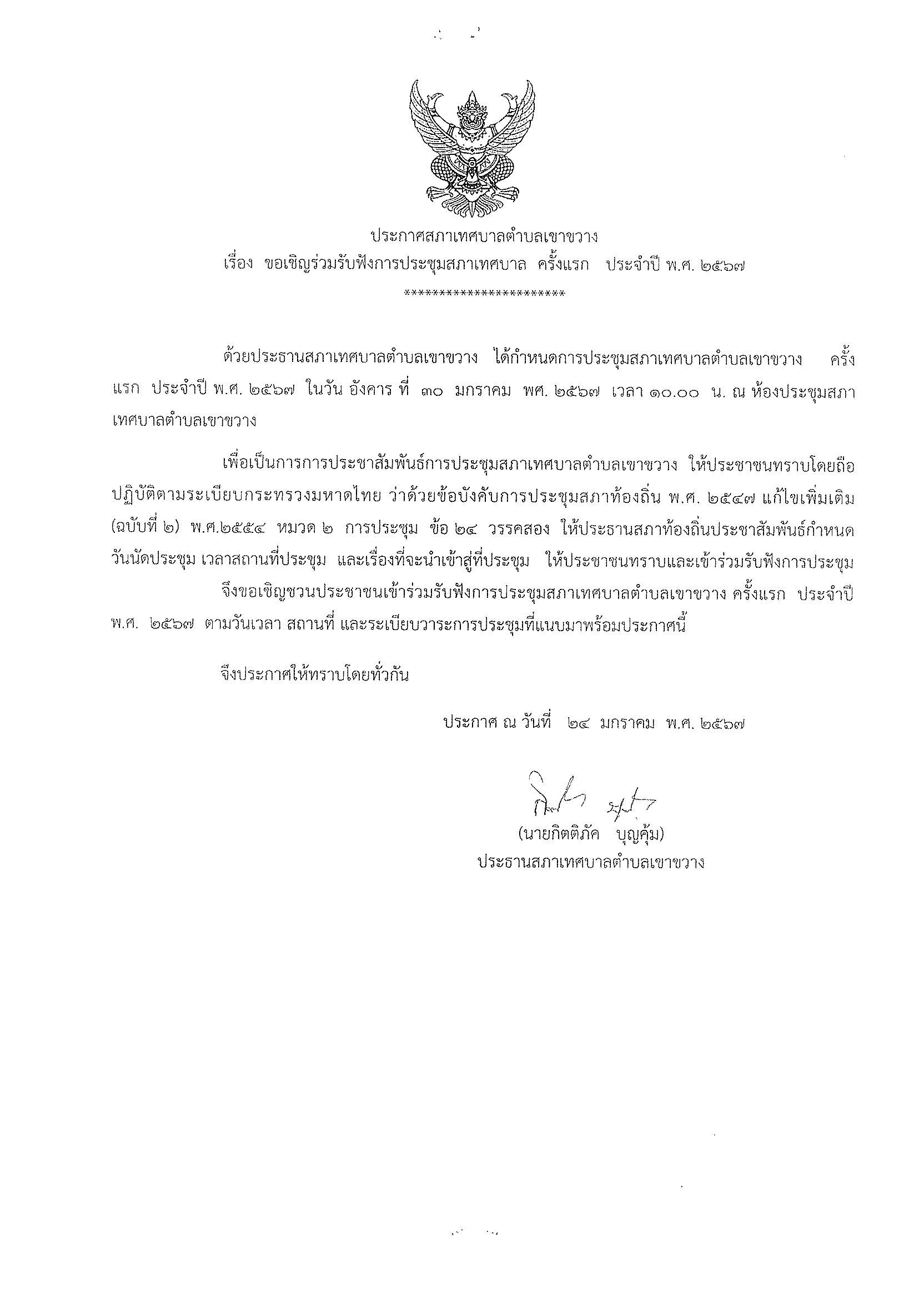 ขอเชิญร่วมรับฟังการประชุมสภาเทศบาล ครั้งแรก ประจำปี พ.ศ. 2567