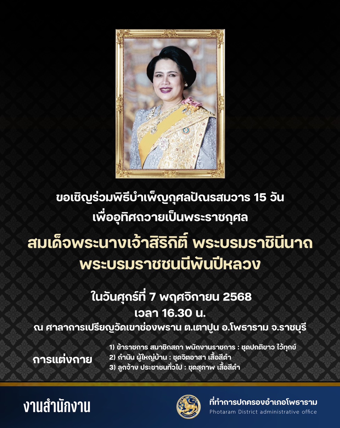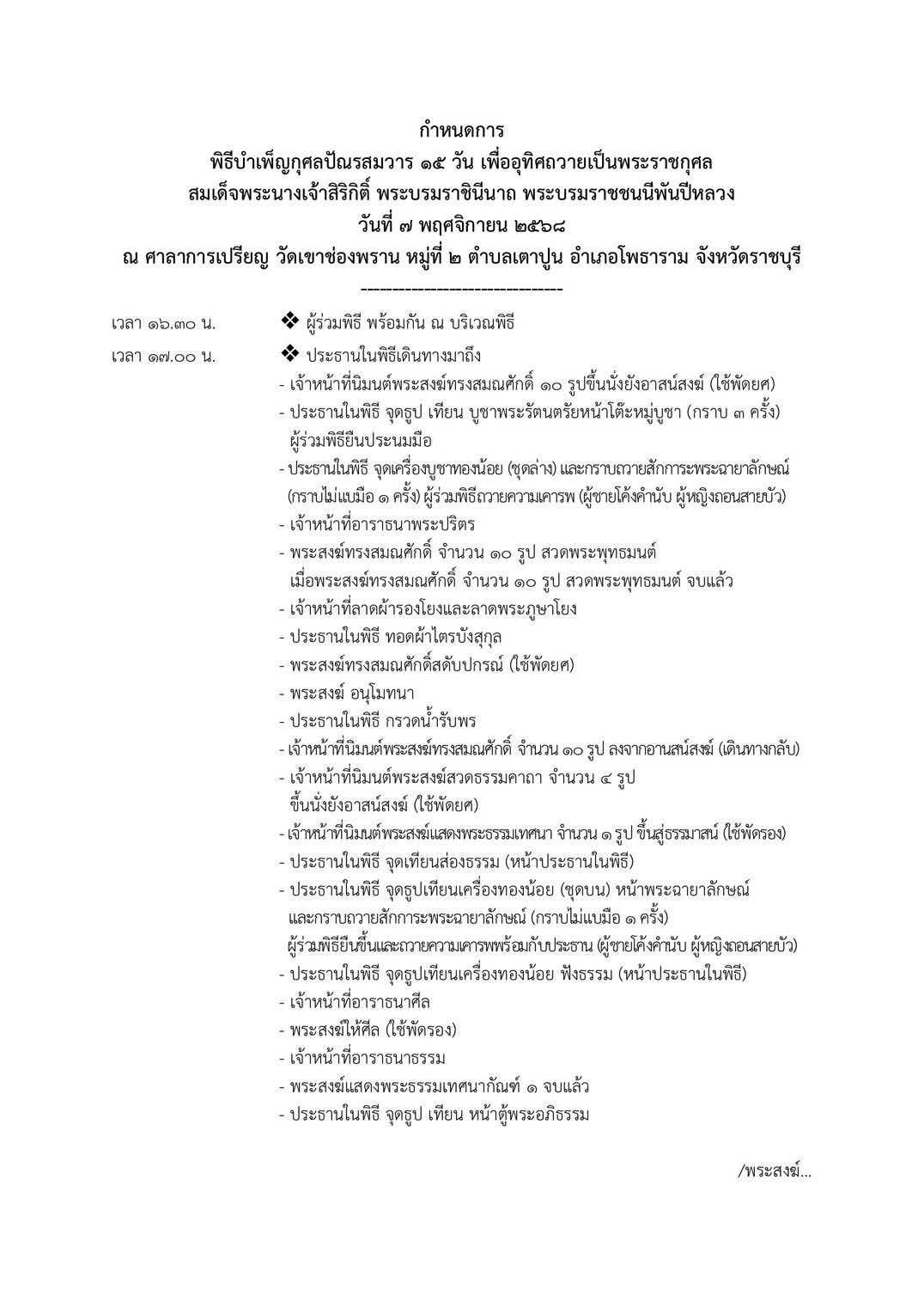 ขอเชิญร่วมพิธีบำเพ็ญกุศลปัณรสมวาร ครบ 15 วัน เพื่ออุทิศถวายเป็นพระราชกุศล สมเด็จพระนางเจ้าสิริกิติ์ พระบรมราชินีนาถ พระบรมราชชนนีพันปีหลวง ณ วัดเขาช่องพราน