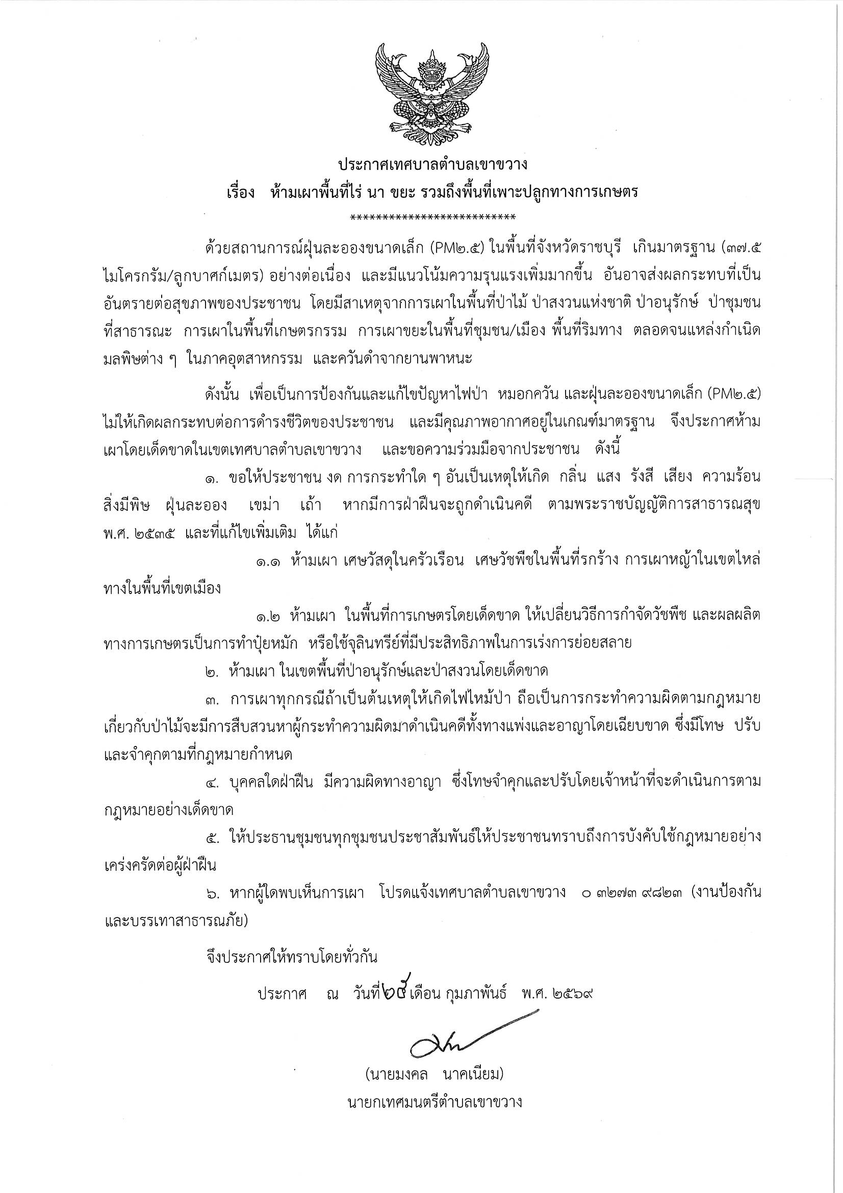 ประกาศเทศบาลตำบลเขาขวาง เรื่อง ห้ามเผาพื้นที่ไร นา ขยะ รวมถึงพื้นที่เพาะปลูกทางการเกษตร