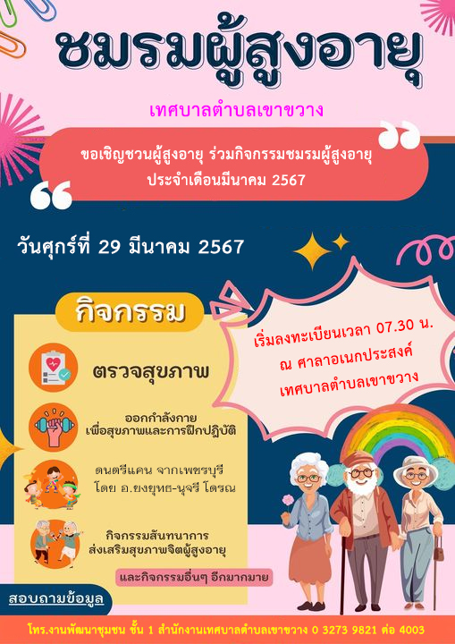 ขอเชิญชวนผู้สูงอายุในเขตเทศบาลตำบลเขาขวาง ร่วมกิจกรรมชมรมผู้สูงอายุ ประจำเดือนมีนาคม 2567